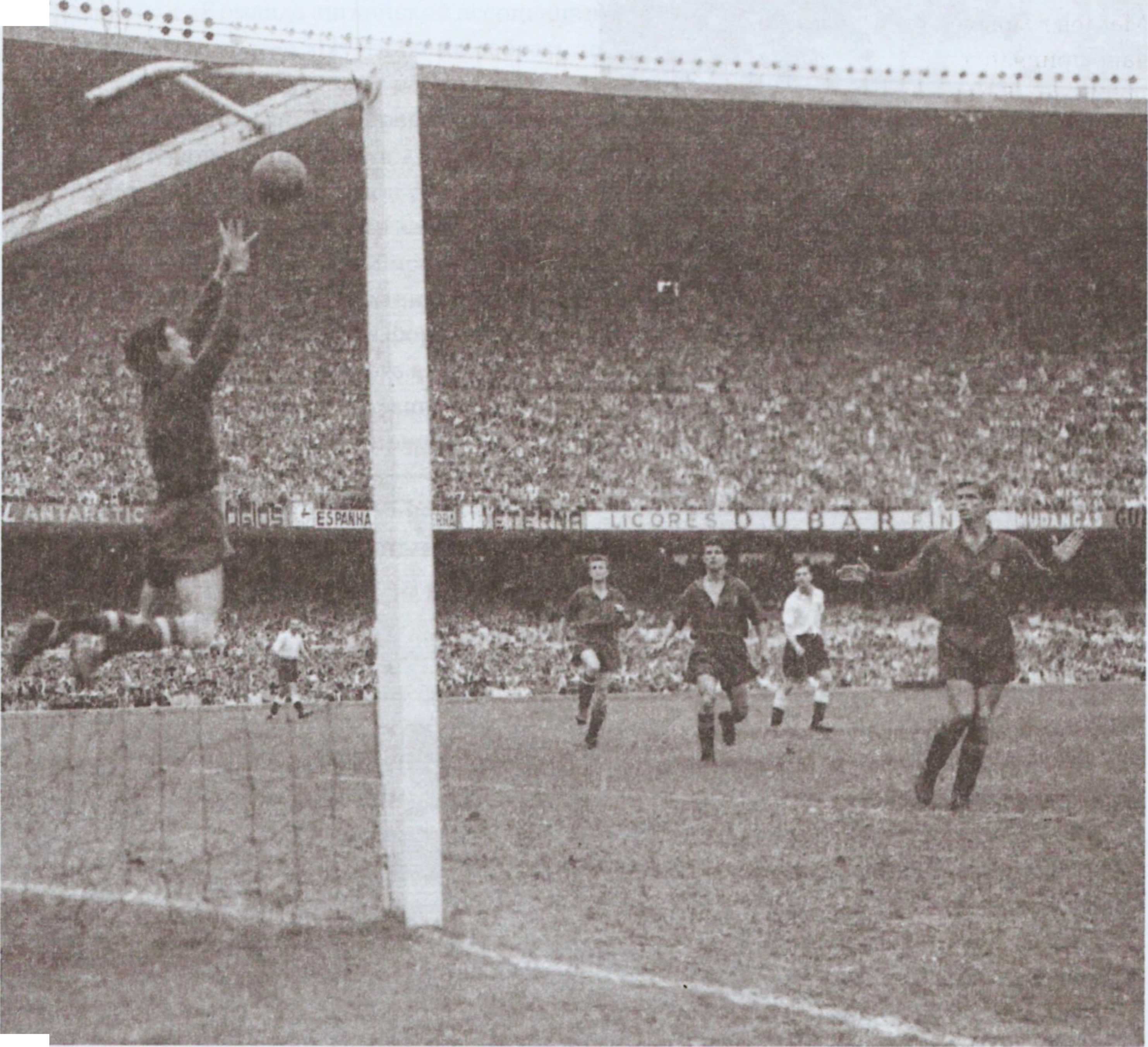Голкипер сборной Испании Антонио Рамахьетс вытаскивает очередной мяч, посланный настойчивыми англичанами. Испанцы побеждают... А кто это там вдали маячит, на правом фланге английской атаки? Уж не легендарный ли Стэнли Мэтьюз, будущий сэр? А по центру — не вечный ли его партнер по нападению Стэнли Мортенсен?