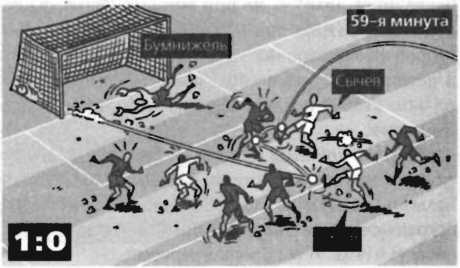 Как, как.., Снова со стандарта! Бельгия получает право на угловой. Японцы выносят, бельгийцы подхватывают и хоть не сразу, но возвращают мяч в штрафную. Делает это... Ван Мейр, причем чуть ли не от центральной линии и в зону левого инсайда, примерно в ту же самую точку, откуда забил Марк Вилмотс. Только сейчас не он, а левый защитник ван дер Хейден - он мягко бьет по отскочившему от газона мячу', и тот, перелетев через Нарадзаки, опускается в сетку за его спиной.