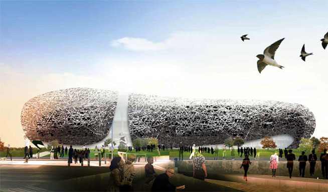 Стадион спроектирован на небольшом холме и напоминает шелковистый кокон с металлическими полосками и балками, ограждающими усиленную бетонную конструкцию, в которой вырезаны огромные прозрачные отверстия.