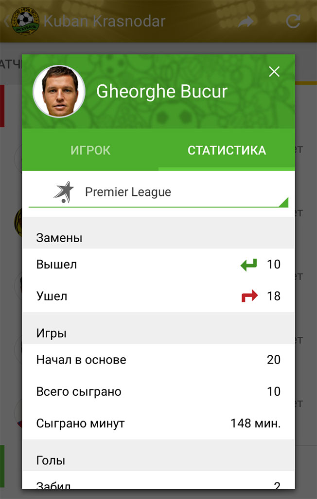 Здесь же Вы можете посмотреть видеозаписи голов и голевых моментов. Ну а если мы ткнём пальцем в какого-нибудь игрока, то получим всю информацию об этом футболисте (как основную, так и статистическую). Вплоть до того, какая нога рабочая и сколько в среднем минут требуется этому футболисту для того, чтобы забить гол.