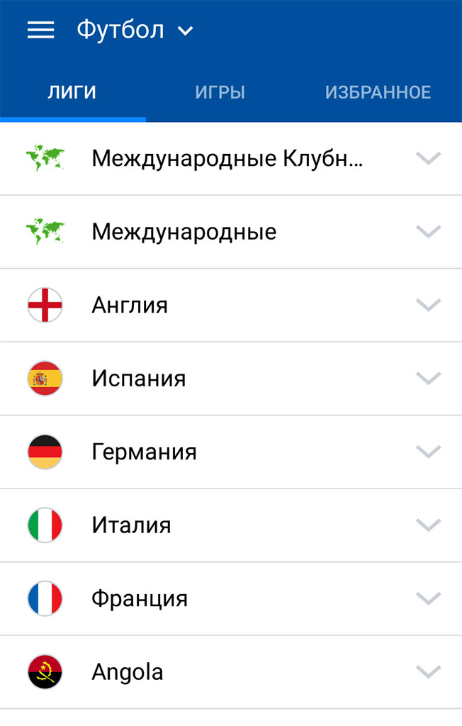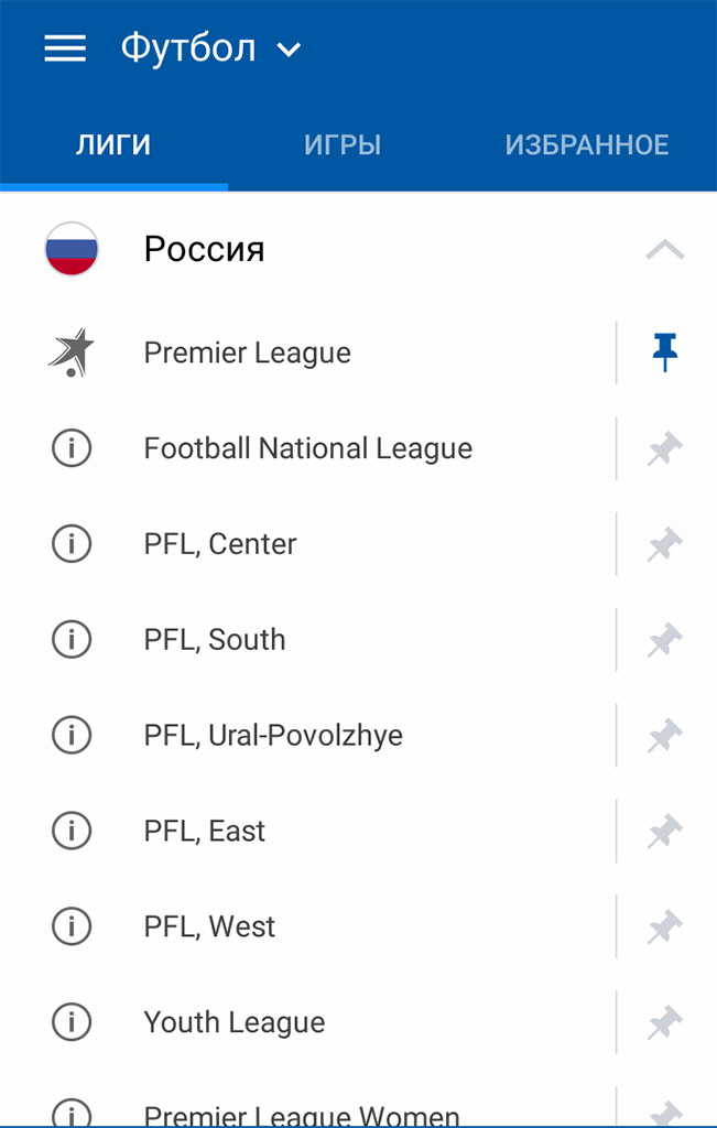 По-умолчанию открывается раздел «ФУТБОЛ» и список стран, о национальных чемпионатах которых нам может рассказать программа «LiveScore». Есть всё, даже чемпионат Гибралтара и первенство Омана. Ткнув пальцев в выбранную страну, например, Россию, мы увидим список всех внутренних турниров. Так, в нашем случае, ими будут РФПЛ, ФНЛ, Зоны «Юг», «Запад», «Восток», «Центр», Молодёжное первенство, Кубок России и даже Чемпионат среди женщин. И так по каждой стране. Та жа Германия представлена в приложении всеми своими бесчисленными бундеслигами. Каждый турнир, в сою очередь, раскрывается на календарный список матчей с результатами: